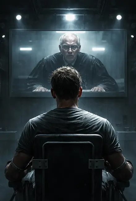 For a moment, the screen is static, then it resolves into the judge’s face. He appears closer than any man should. The resolution is sharp enough to count the red threads in the whites of his eyes. Three identical stacks of paper sit before him, squared with geometric precision. He taps the screen with a forefinger, adjusts his spectacles, and looks directly into the lens.